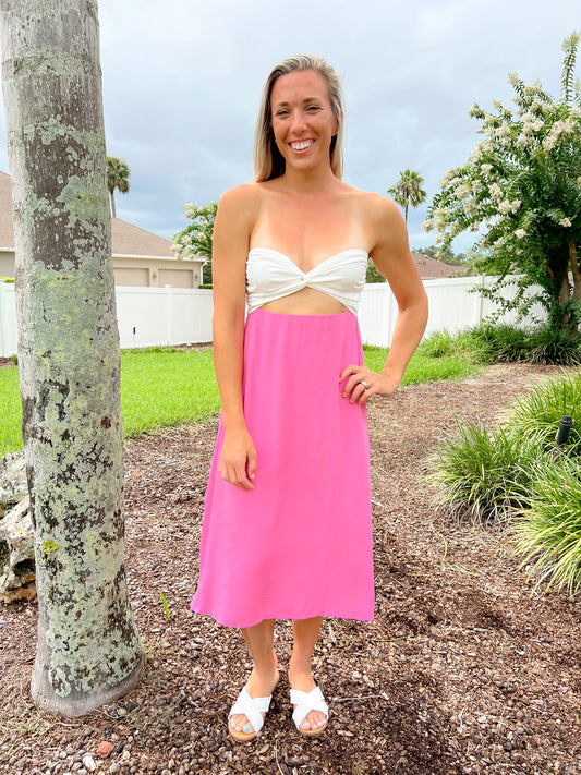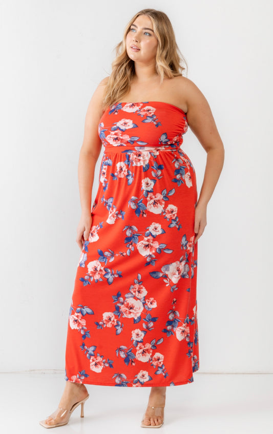 Red Rose Print Ruched Strapless Midi Dress- Plus