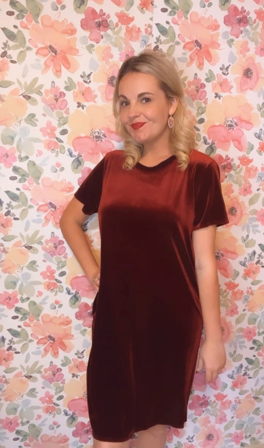 Velvet Short Sleeve Tunic Dress- Burgundy